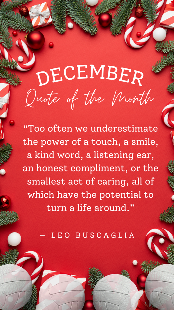 As Leo Buscaglia once said, "Too often we underestimate the power of a touch, a smile, a kind word, a listening ear, an honest compliment, or the smallest act of caring, all of which have the potential to turn a life around." These words ring true not only in our personal relationships but also in volleyball. We are part of a sport where the smallest acts of kindness and encouragement can make a huge difference in a person’s experience.